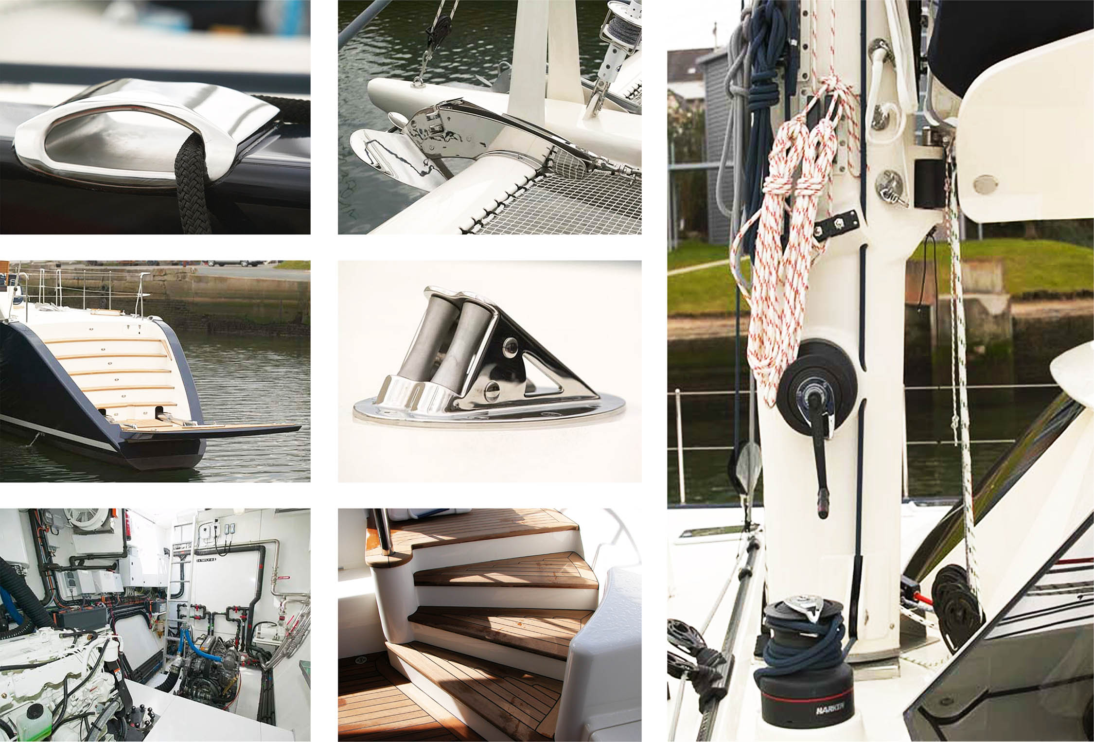 Celle ci distribue l’accès aux quatre cabines et salles de bain, à la cuisine et la buanderie dans les flotteurs.