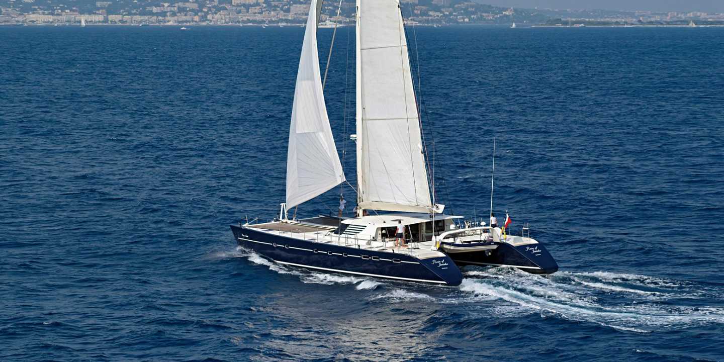 Le bateau est organisé autour d’un vaste espace de salons intérieur et extérieur, d’une table de repas pour 8 personnes, d’un bar et d’un espace navigation en nacelle.