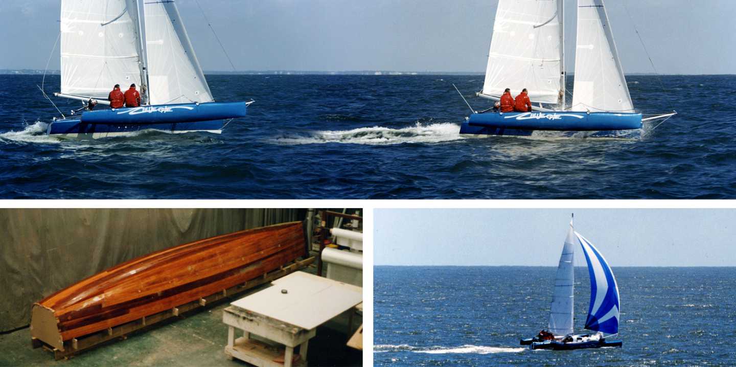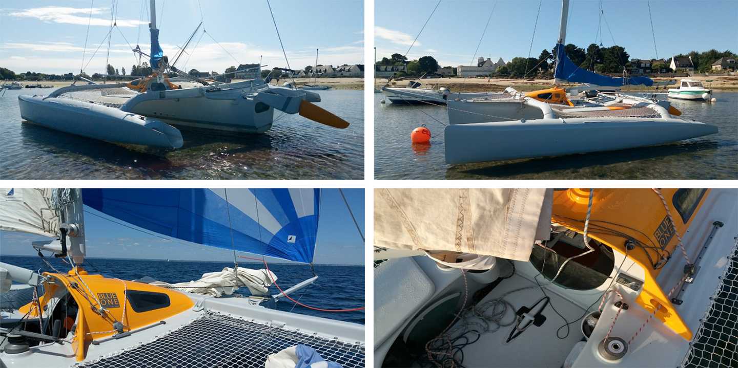 Le prototype, construit en collaboration avec le chantier Espace Bleu Ocean, à Saint Nazaire, a été réalisé en strip planking de Red Cedar / epoxy pour la coque centrale et mousse shapée pour ses flotteurs, garantissant très largement son insubmersibilité.