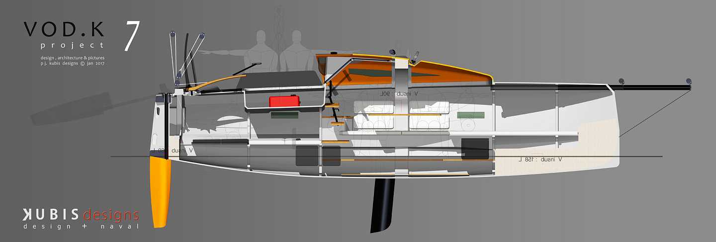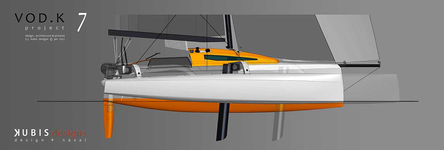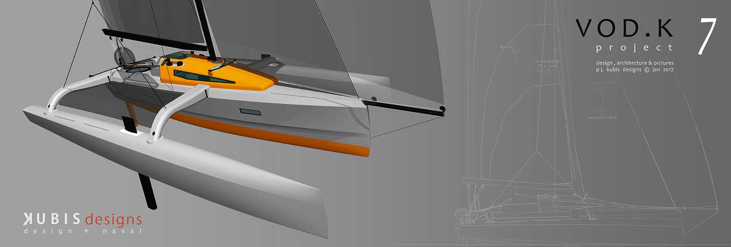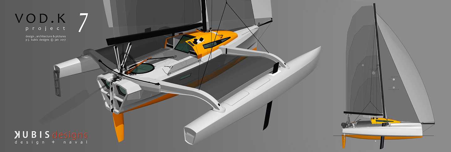 Design & naval Architecture studies for a fast folding day boat trimaran, organized around a central cockpit.